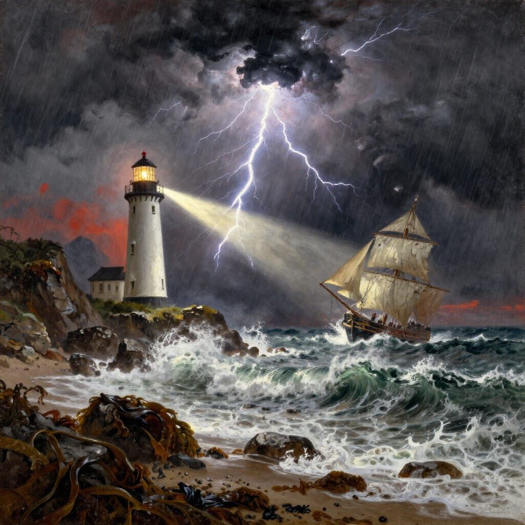 The wind blows, the lightning strikes sail and mast a like. No good sailor ever loved a storm, never true sailor ever felt a longing for the shore more than during a rough storm. The light house shines its light of hope, and yet the jagged rocks dash those hopes away. Avast, and heed well me hearties..ol' davy be a callin' us this night!