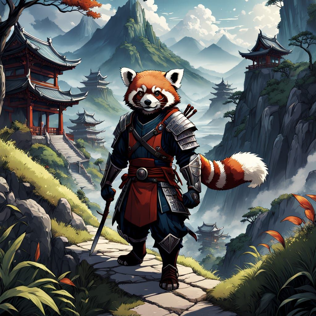 Digital matte painting of a red panda warrior in ornate samurai armor on a mountain path. Features comic book art style with sharp lines and dramatic lighting.