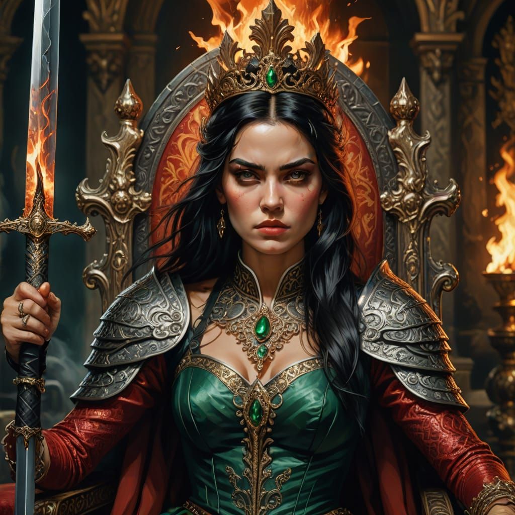 This image shows a fierce warrior princess in a close-up portrait, surrounded by luxurious textures and ornate patterns. She sits on a throne made of swords, wearing a blood-red dress and holding a flaming sword, with dramatic lighting and rich colors.