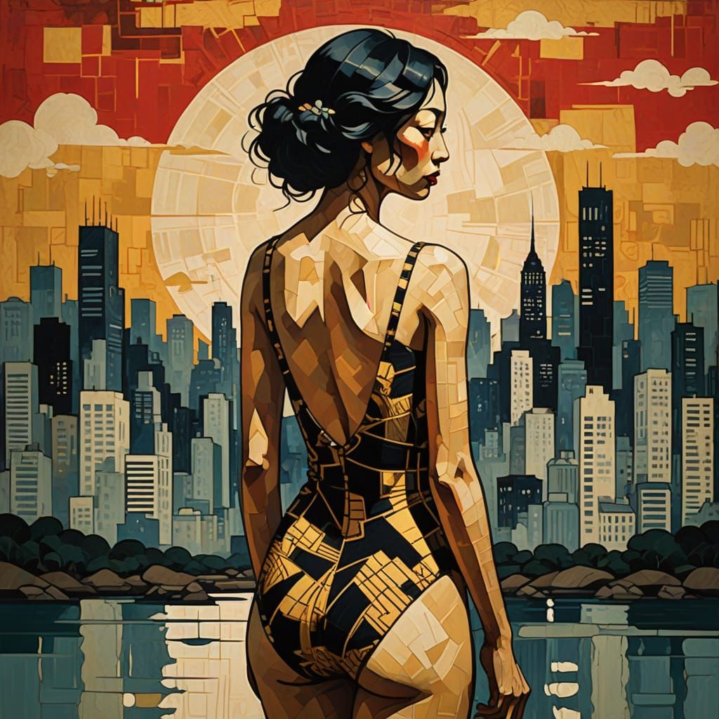 A digital painting blending Ukiyo-e and modern art styles. A woman in a patterned swimsuit stands against a city skyline bathed in golden hour light.