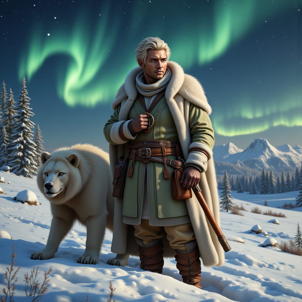 This image shows a handsome Siberian prince with blond hair and dark eyes, dressed in traditional fur clothing and holding hunting weapons. The scene includes a majestic bear and aurora borealis, rendered with a realistic and mystical atmosphere.