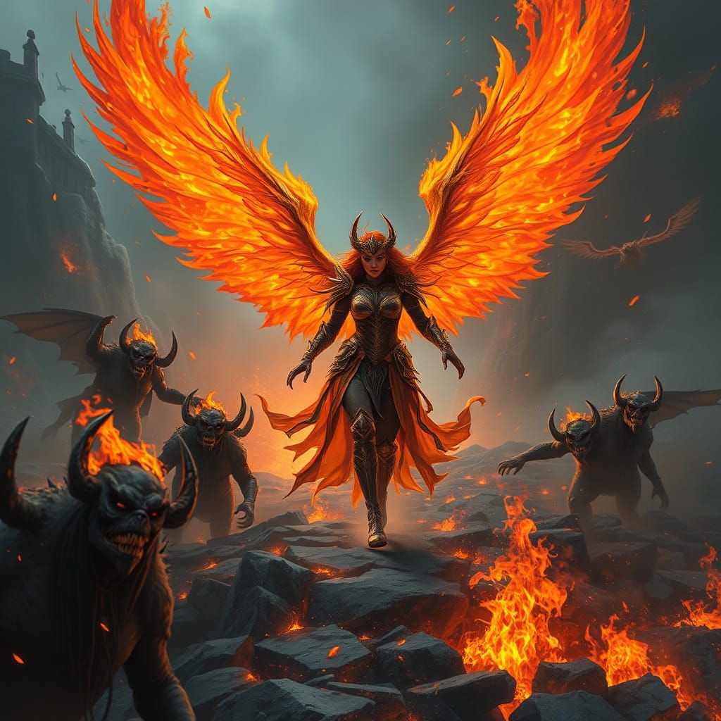 A striking picture of a fire sorceress in phoenix armor, journeying to a frozen hell. Escaping demons surround her, leaving a fiery trail in this digital art piece.