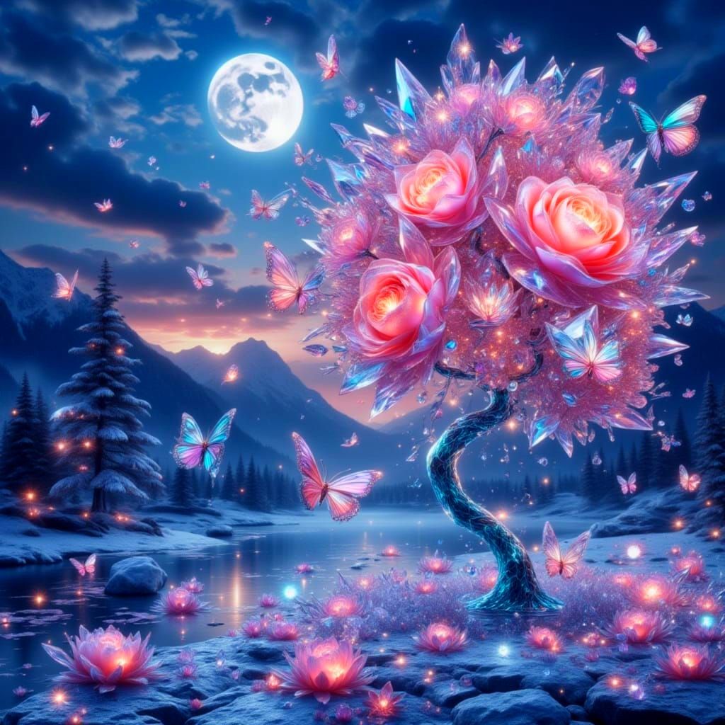 This AI-generated image features a double exposure scene beside a frozen lake at twilight. A crystal rose tree blooms, with delicate crystal butterflies emerging from its center.