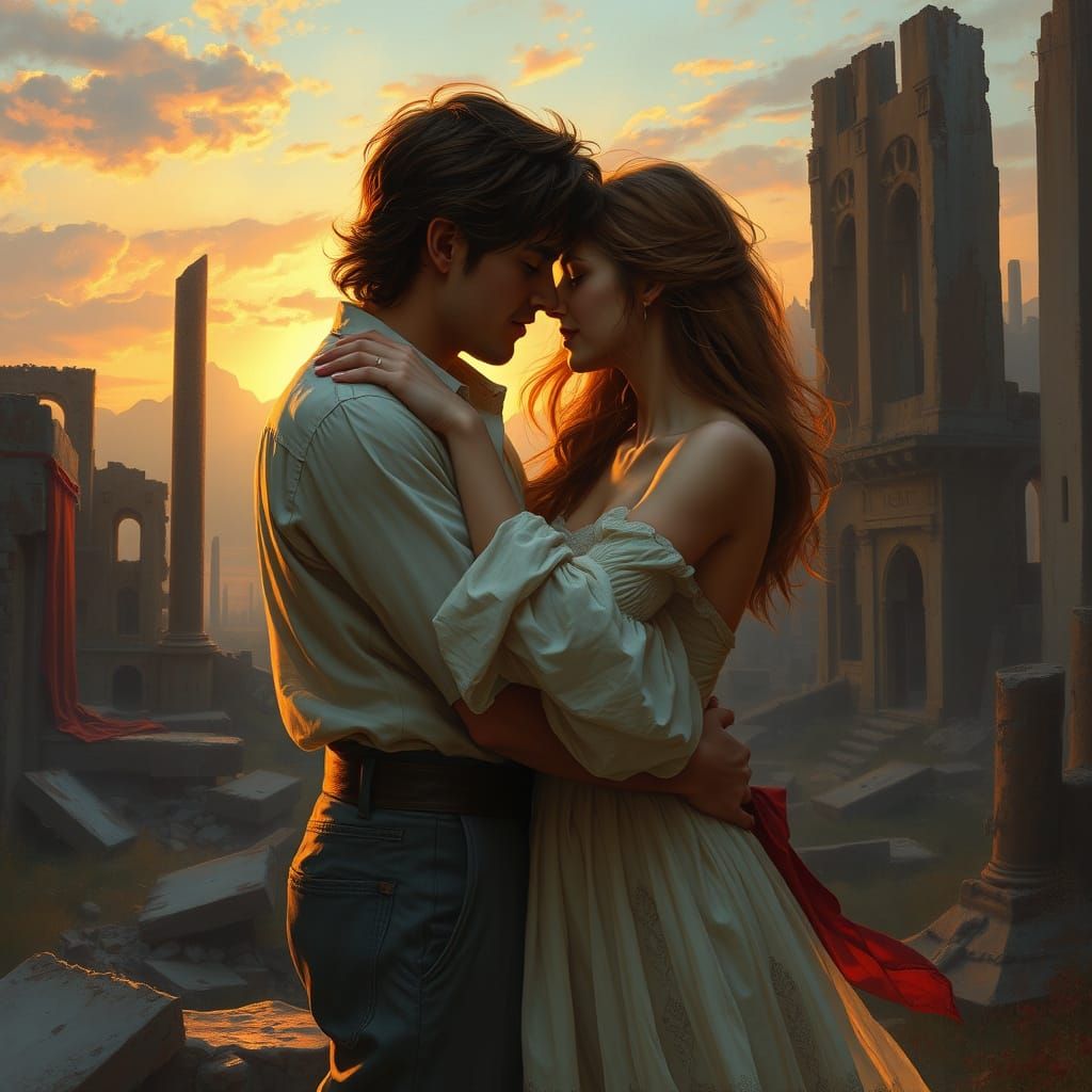 This painterly image depicts a young couple passionately embracing in desolate city ruins at twilight. Their love, illuminated by dramatic light and vivid colors, symbolizes a new beginning amidst fragility.