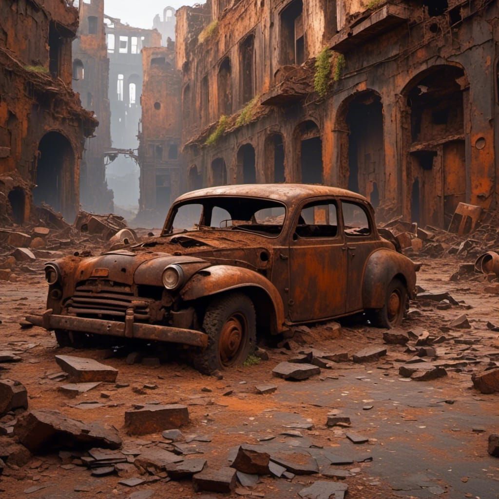 This image shows a desolate, ruined city with rusty cars and crumbling buildings. A lone woman walks through the streets in this scene of urban decay.