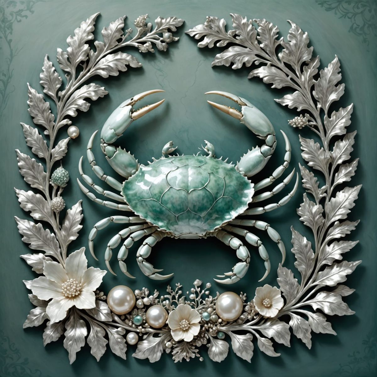 This image depicts a pearlescent crab on silver coral, surrounded by acanthus leaves and shells. The scene blends Rococo and Baroque elements with soft sea-green tones and a lunar shimmer.