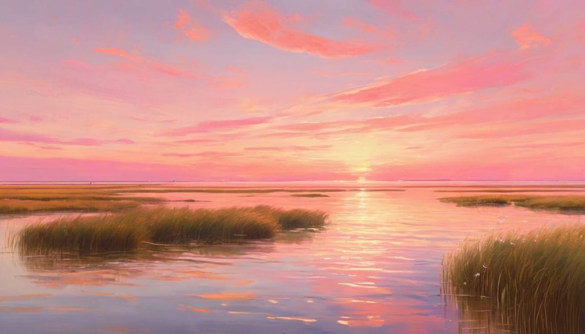 This image shows whimsical fantasy art of Ottifanten in the Wattenmeer during a sunset. A vibrant oil painting with warm colors creates a serene and peaceful atmosphere in a dreamy fantasy landscape.