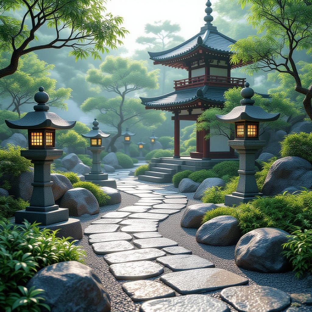 This image showcases a tranquil Japanese garden featuring stone lanterns and winding paths, depicted in a detailed 3D anime style with soft lighting and atmospheric fog.