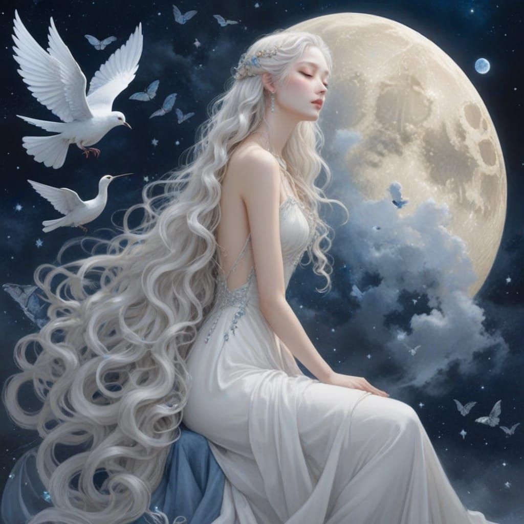 A hyperrealistic image of a beautiful woman with long white hair, sitting barefoot on a crescent moon playing a flute. Small silver doves and butterflies add to the anime aesthetic.