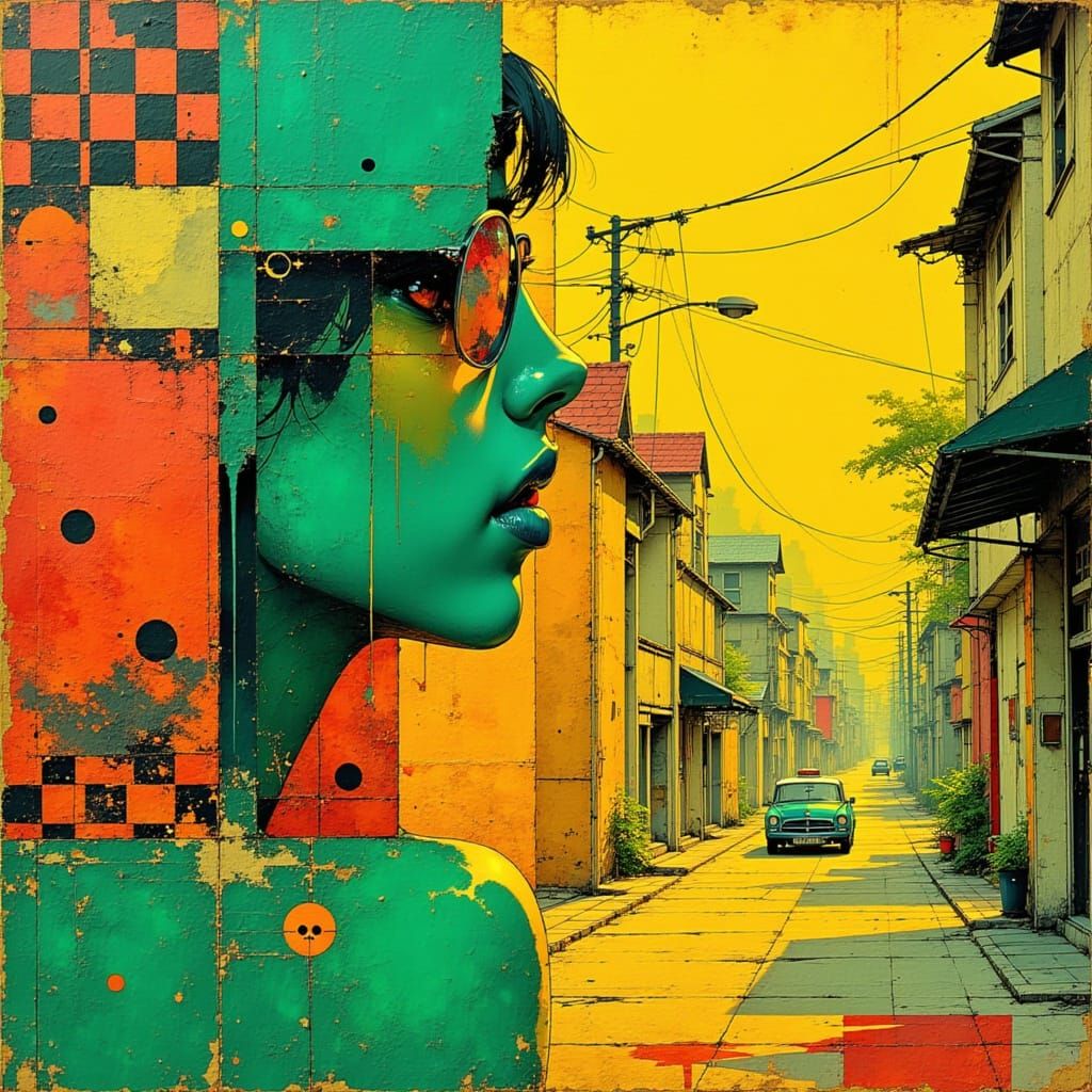 This digital artwork captures urban heat in amber tones, with mirrored glasses reflecting green skies. Facades suggest jazz, and a checkerboard taxi adds rhythm. Pixelated fabric elements add playful defiance.