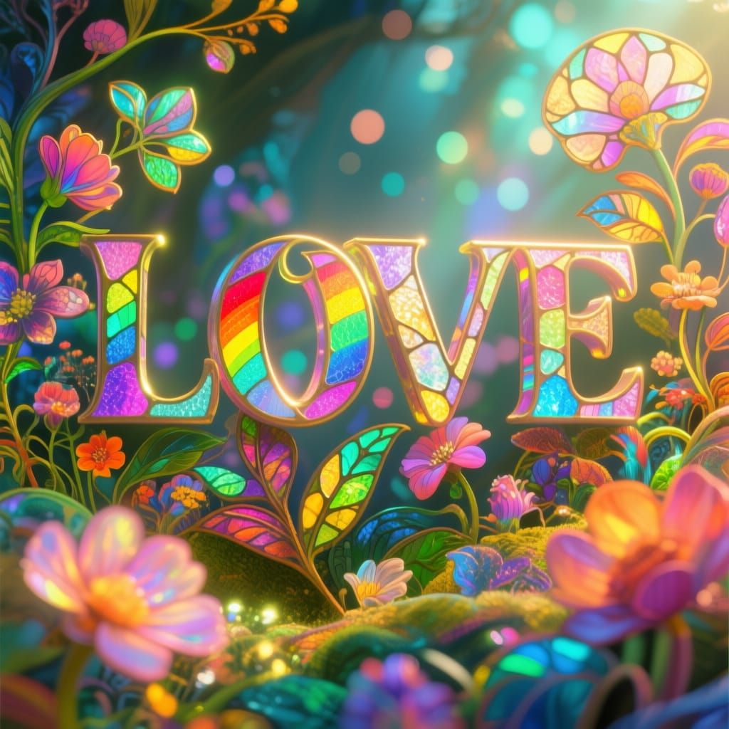 This image showcases the word 'LOVE' in vibrant, glowing 3D letters with an iridescent, stained-glass effect. It is surrounded by lush fantasy flowers and foliage in rich, contrasting colors.