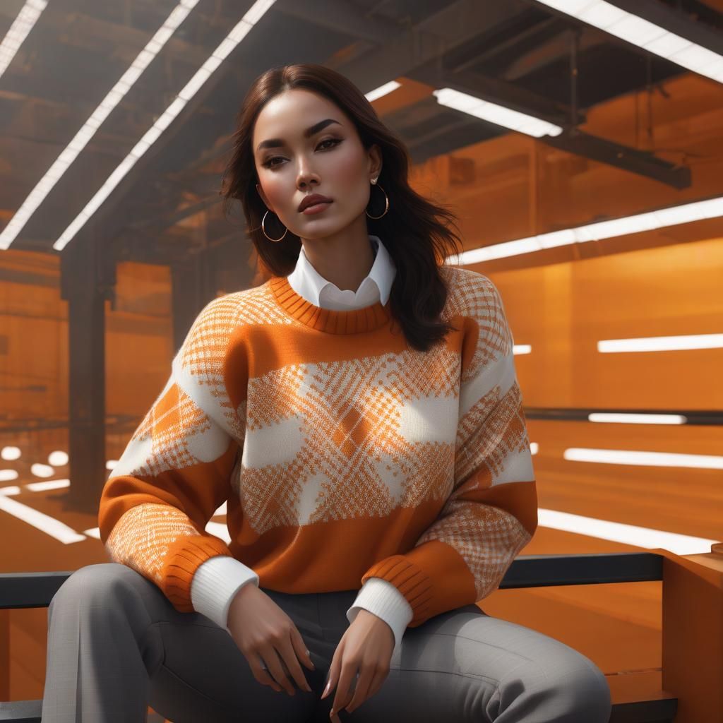 This image shows a woman wearing a checkered sweater with a plaid pattern. The color palette features warm oranges and whites in a digital art style.