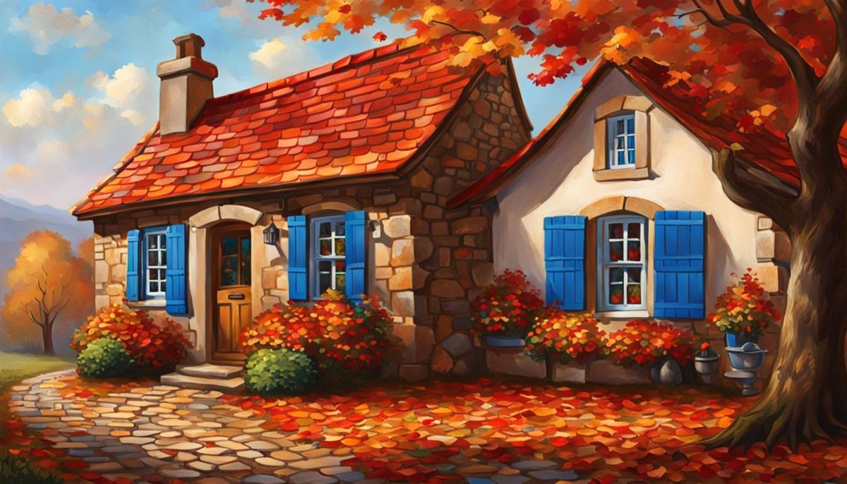 A digital painting shows a quaint stone cottage with red roof tiles and blue shutters. Autumn leaves cover the cobblestone path, creating an old-world charm in an impressionist style.