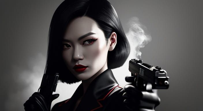 A striking picture of a British woman holding a handgun in a film noir aesthetic. The vintage photography style features dramatic shadows, luxurious fabrics, and a mysterious atmosphere.