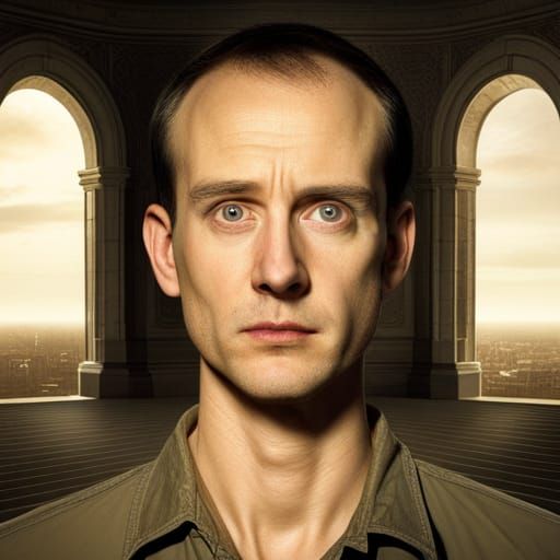 This image shows a movie poster-style matte painting of a young man with exaggerated features. The composition uses a golden ratio to enhance the horror film aesthetic.