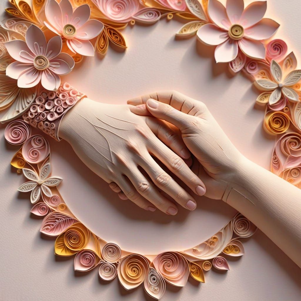 A close-up of hands held in paper art. The image showcases a caregiver with soft pink hues, warm lighting, and delicate paper folds in a whimsical quilling style.