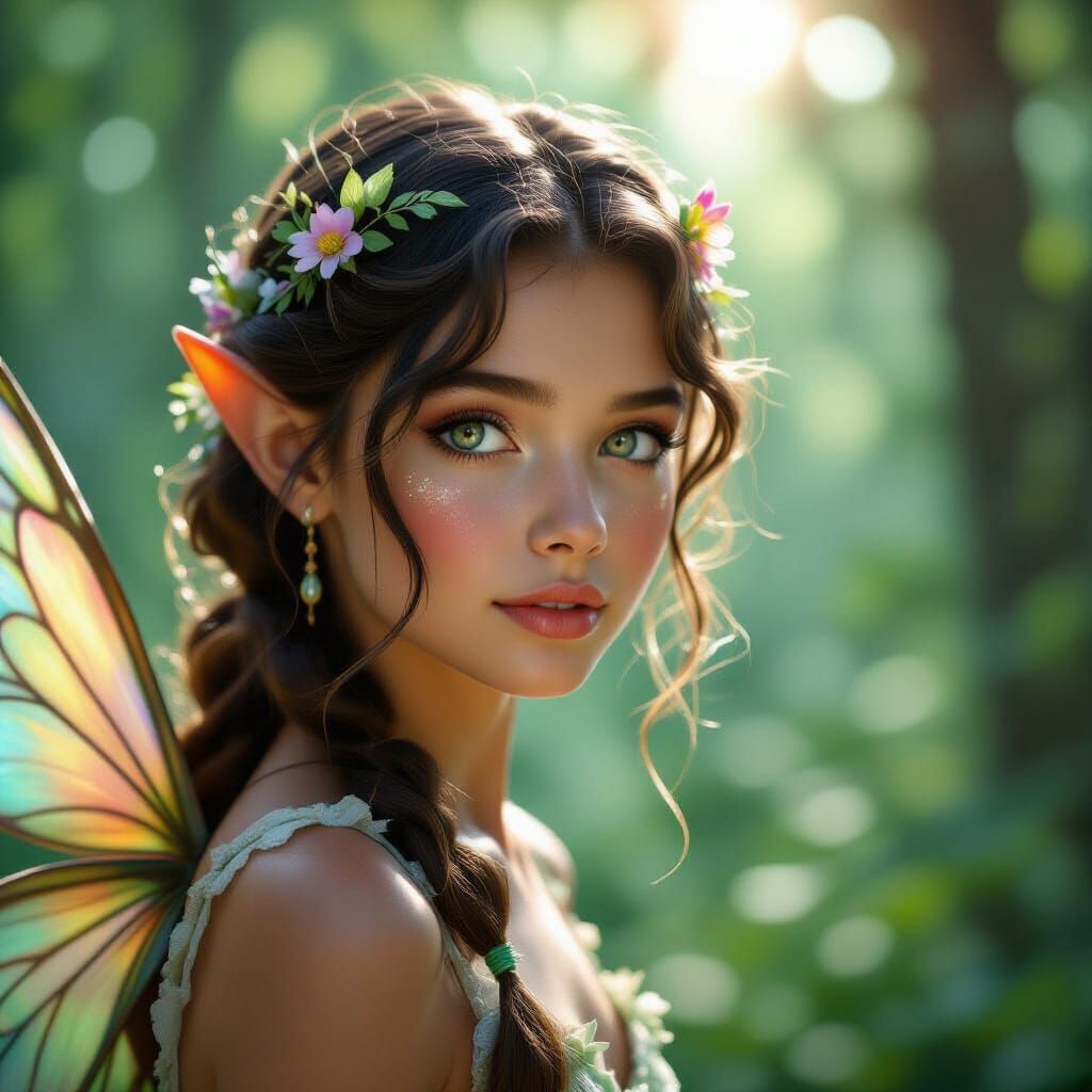 This image shows a forest fairy, depicted in a cinematic style with vivid colors. The girl has delicate features, highlighted by natural light and sparkling eyes against a sky backdrop.