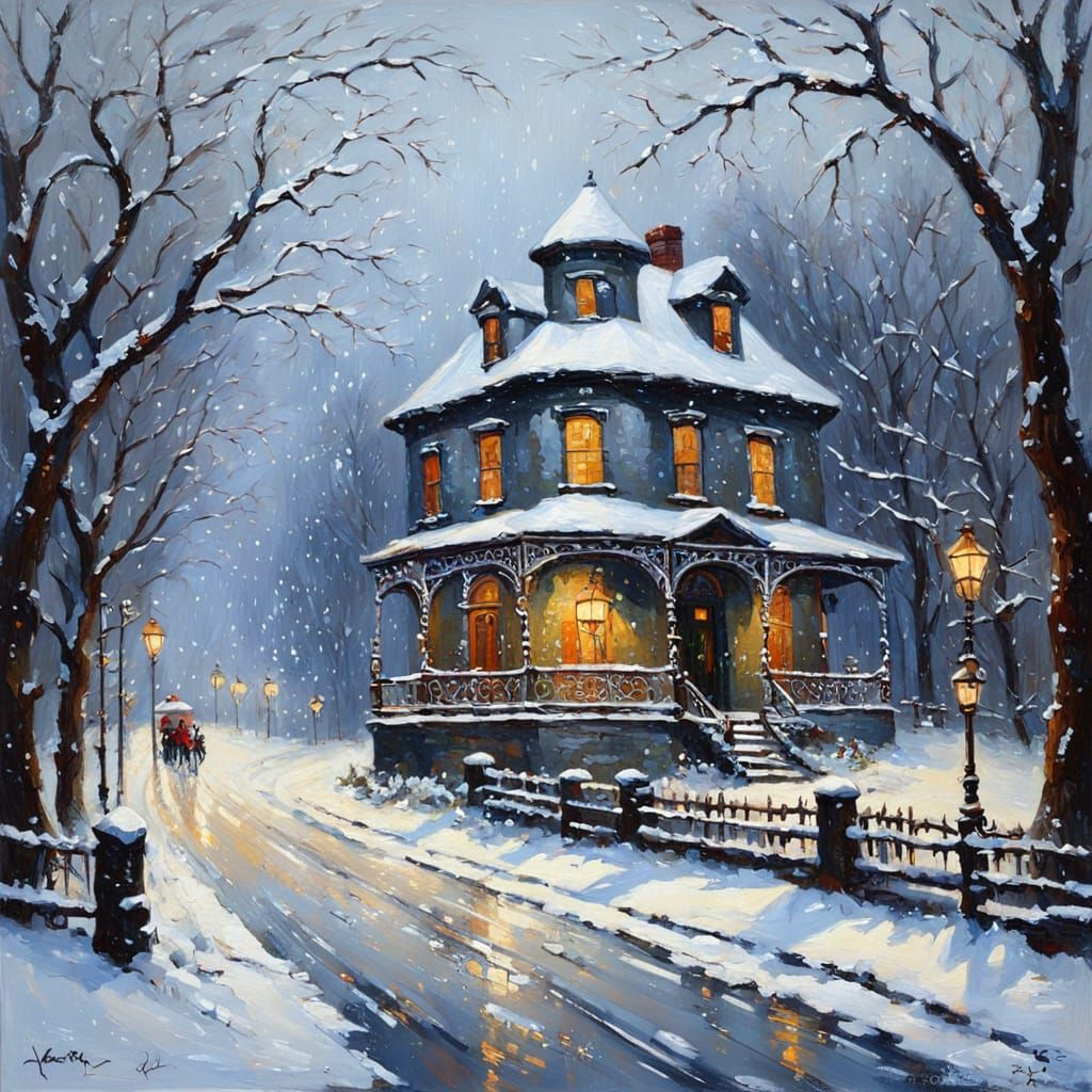 This image depicts a blurred, retro scene of a snowy crossroads with an old round house and two-story panel houses. Intricate tree branches and a wrought iron fence add fine details to the winter landscape.