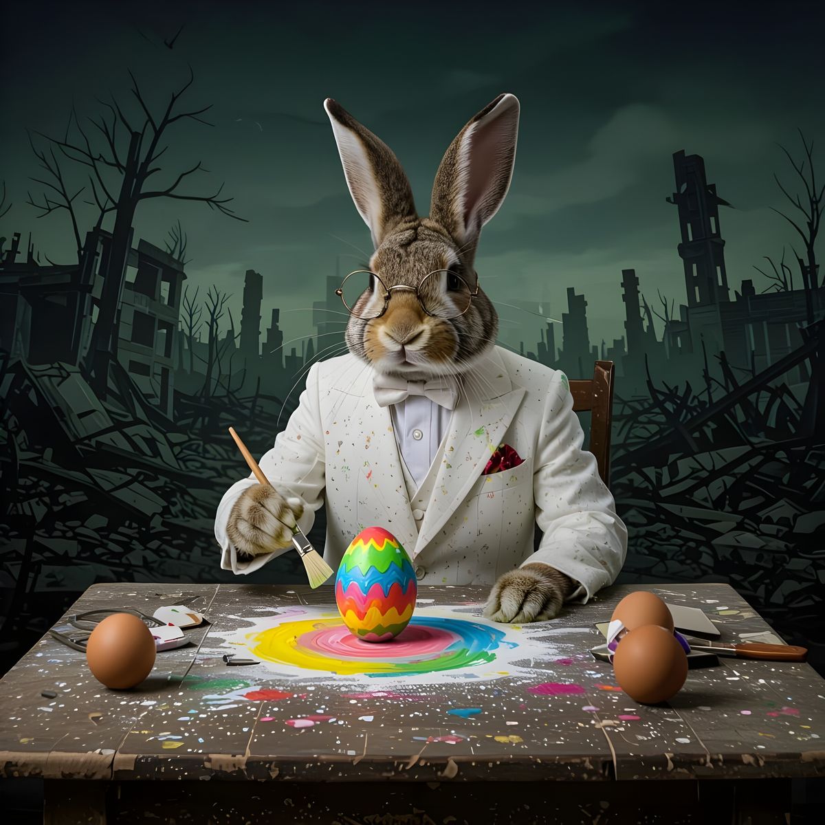 A vintage-clad Easter bunny paints a colorful egg in a dark, dystopian landscape, blending nostalgia and apocalyptic themes in a striking illustration.
