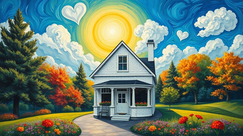 This image shows a whimsical Victorian coffee shop floating in a vibrant sky, painted with thick, expressive brushstrokes in a post-impressionist style.