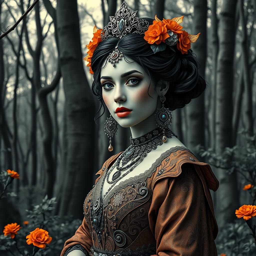 A black and white woodcut-style image of a woman in elaborate clothing in a forest. The artwork features dynamic lighting, detailed textures, and a splash of orange and teal as 3d rendered digital art.