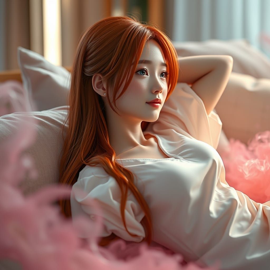 This image shows a serene and endearing portrait of Yae Miko, rendered in a delicate watercolor style reminiscent of Makoto Shinkai's subtle textures and atmospheric lighting. She lies on a plush couch, surrounded by soft pillows and warm glow, exuding comfort and relaxation.