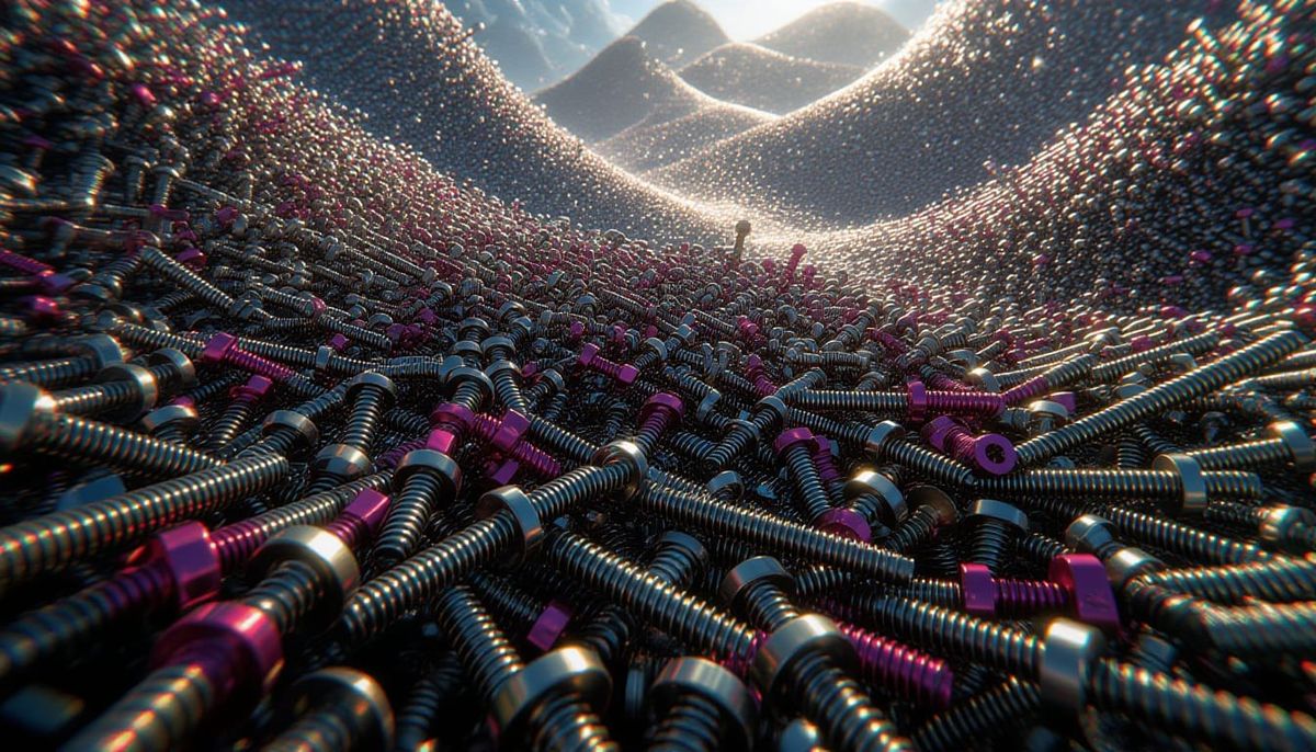 This hyperdetailed charcoal drawing depicts millions of colorful nails and screws arranged in a vast, chaotic landscape. Rendered with cinematic 3D videogame lighting and metallic textures.