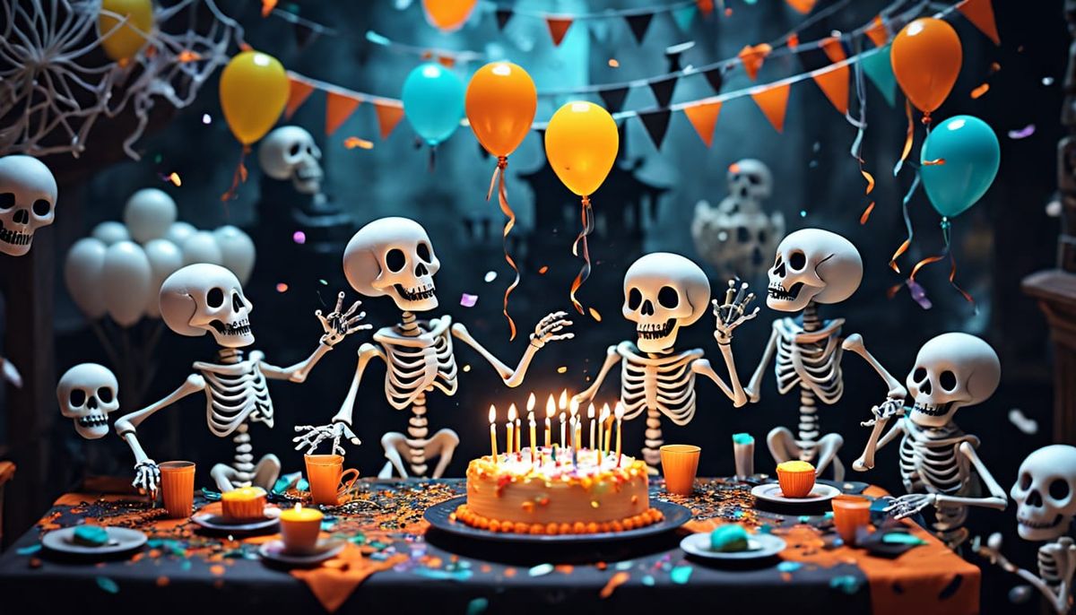 This image shows cute ghosts and skeletons celebrating a birthday with a tilt-shift effect. Eerie yet playful, with ethereal wisps and vibrant colors.