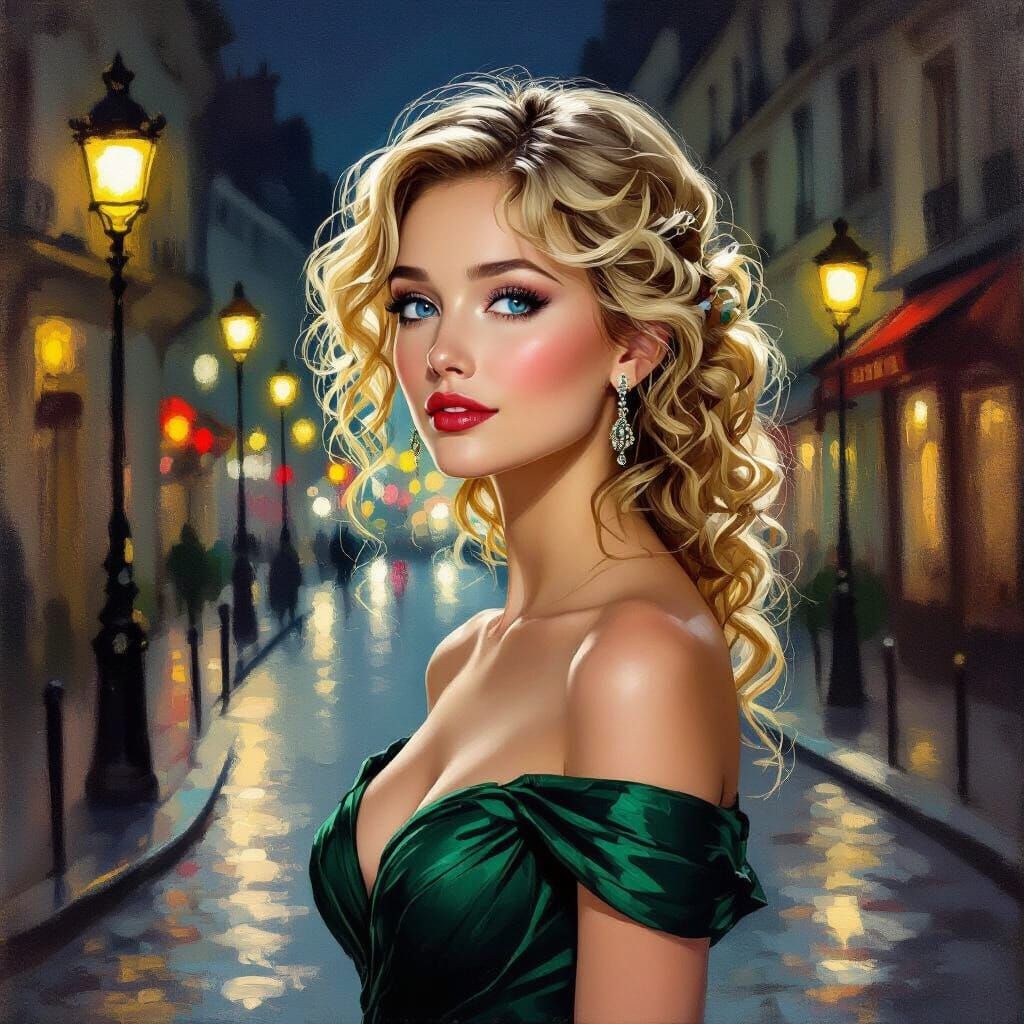This image shows a beautiful blonde woman with curly hair and blue eyes in an emerald dress on a Parisian street at night. Rendered as a romantic oil painting with visible brushstrokes, evoking mystery.