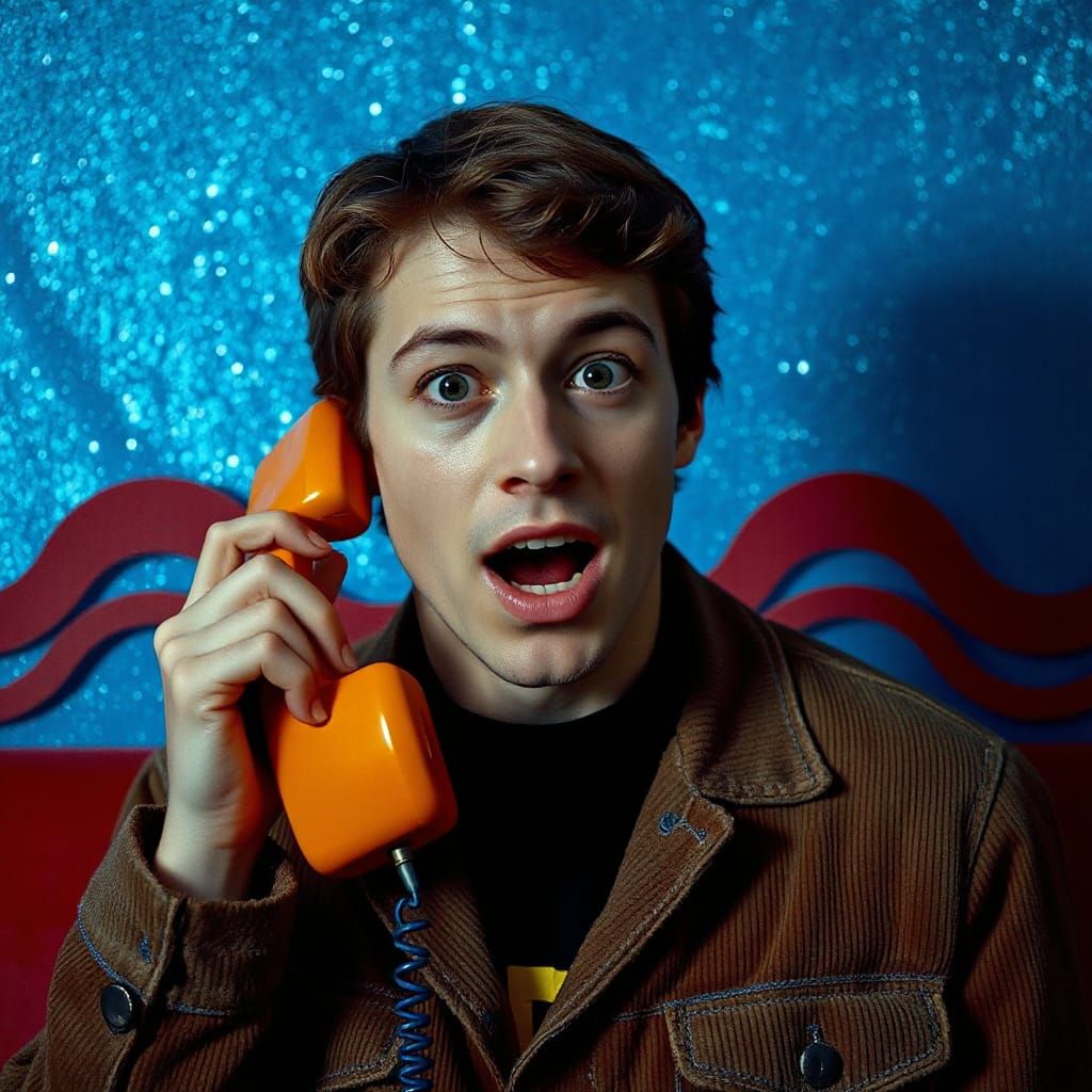 A cinematic photograph of a man with an orange rotary phone. The subject displays a surprised expression, set against a textured blue background with sparkling elements and red patterns. The image features cool blue lighting.