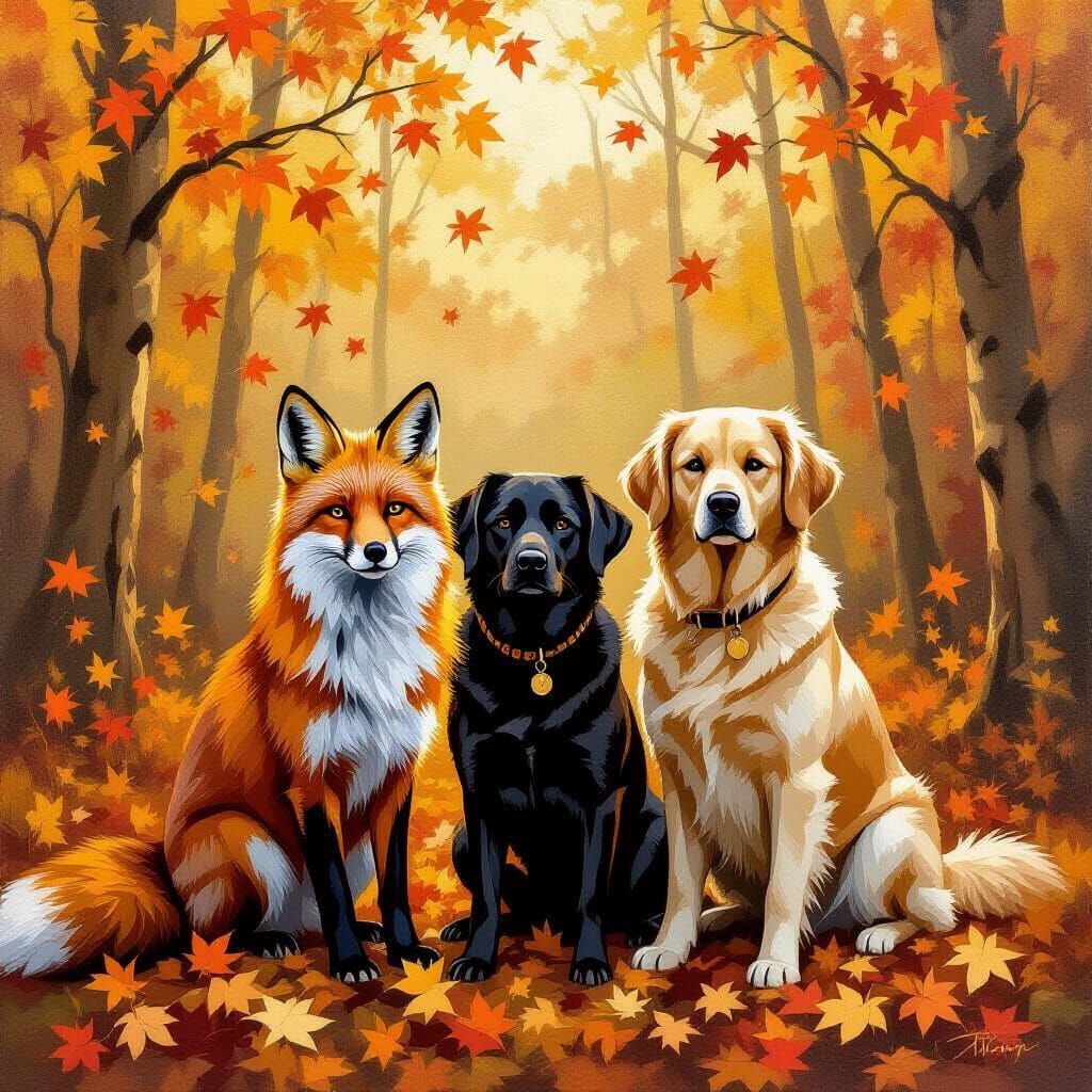 This image shows a majestic fox, a Black Labrador, and a Golden Retriever in a sun-dappled autumn forest. Golden leaves fall around them, creating a nostalgic glow. Rendered in the style of a classic oil painting with visible brushstrokes and a warm palette, it evokes timeless beauty.