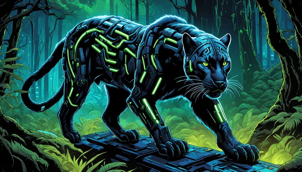 A striking picture of a biomechanical panther in a dark forest. The panther features glowing blue circuits, metallic fur and neon green eyes, rendered with high contrast lighting as comic book art.