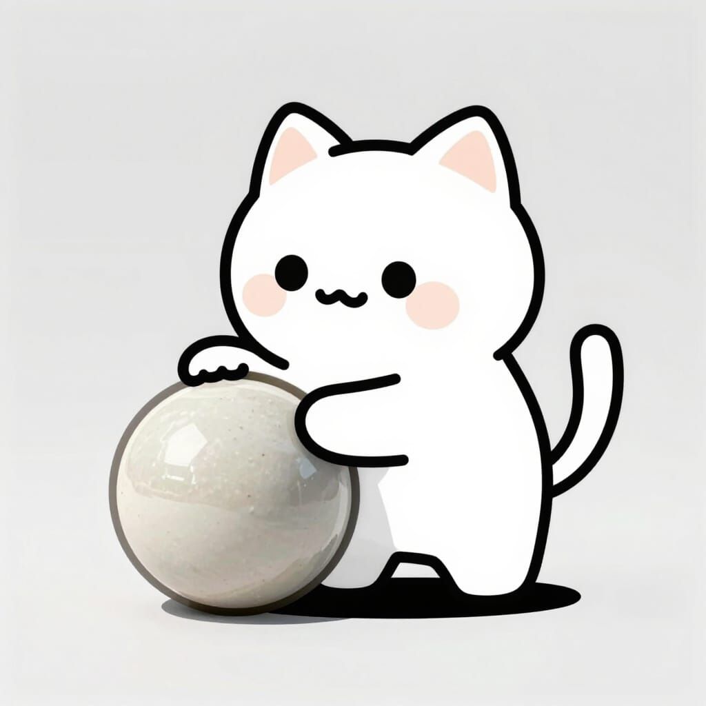 This image shows a cute white chibi cat in a flat, 2D vector style interacting with a realistic 3D ceramic sphere. The artwork features a strong contrast between styles with clean studio lighting.