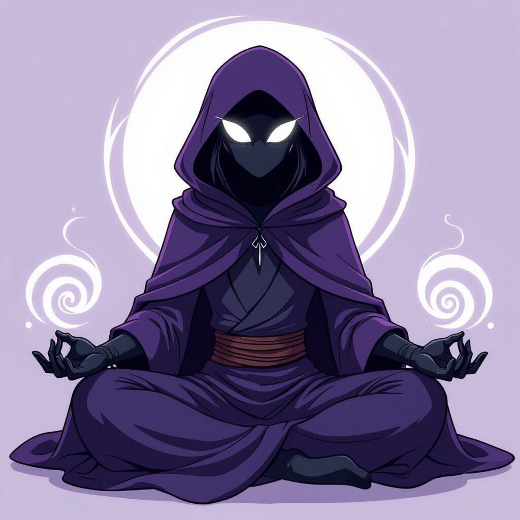 This image shows Raven in a dark purple cloak meditating with glowing white eyes. The artwork features simple cartoon shading, clean outlines and a soft purple magical aura, reminiscent of a 2000s anime aesthetic.