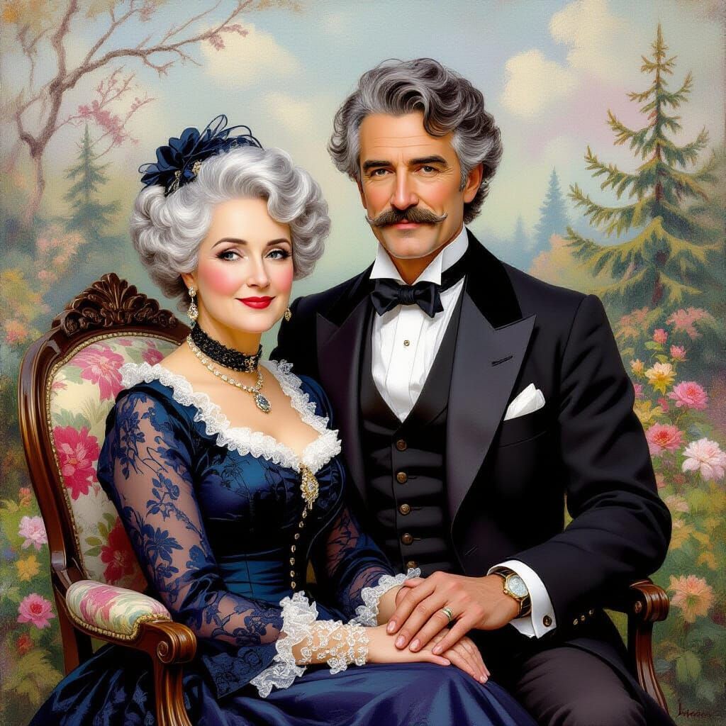 This image shows an elegant Victorian couple in a garden setting. The man stands behind the seated woman's chair. The background is a pastel multicolor in an impressionist style.