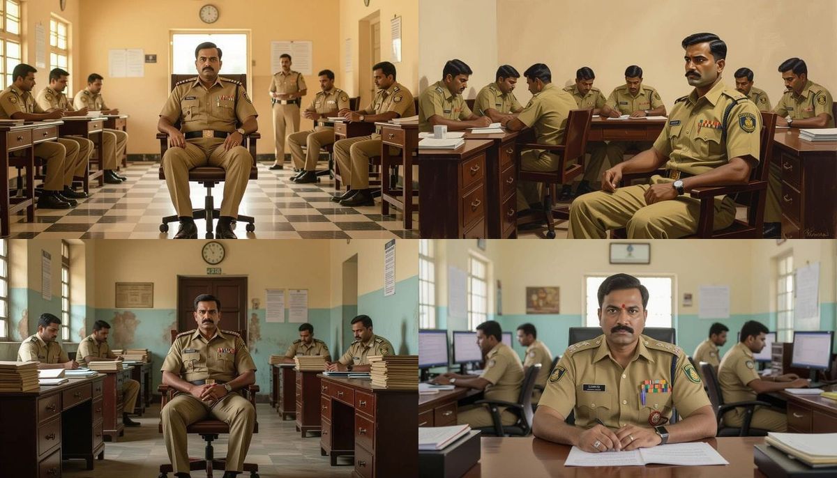 This image shows an Indian police officer in uniform sitting at his desk in a police station. Other officers are working in the background, focused on their duties.