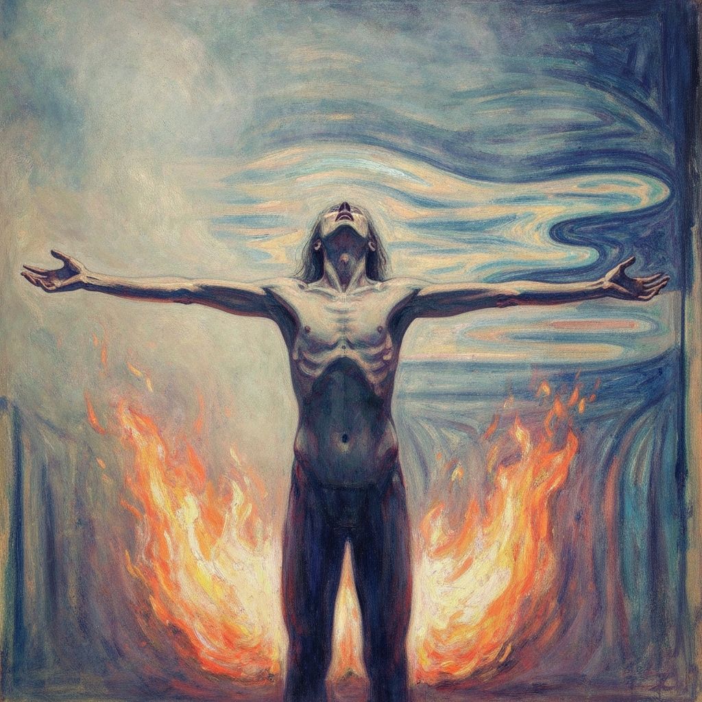 A figure with outstretched arms stands amidst flames and mist, experiencing a cathartic release. The image is rendered with expressive brushstrokes and vibrant colors, in an expressionist style.