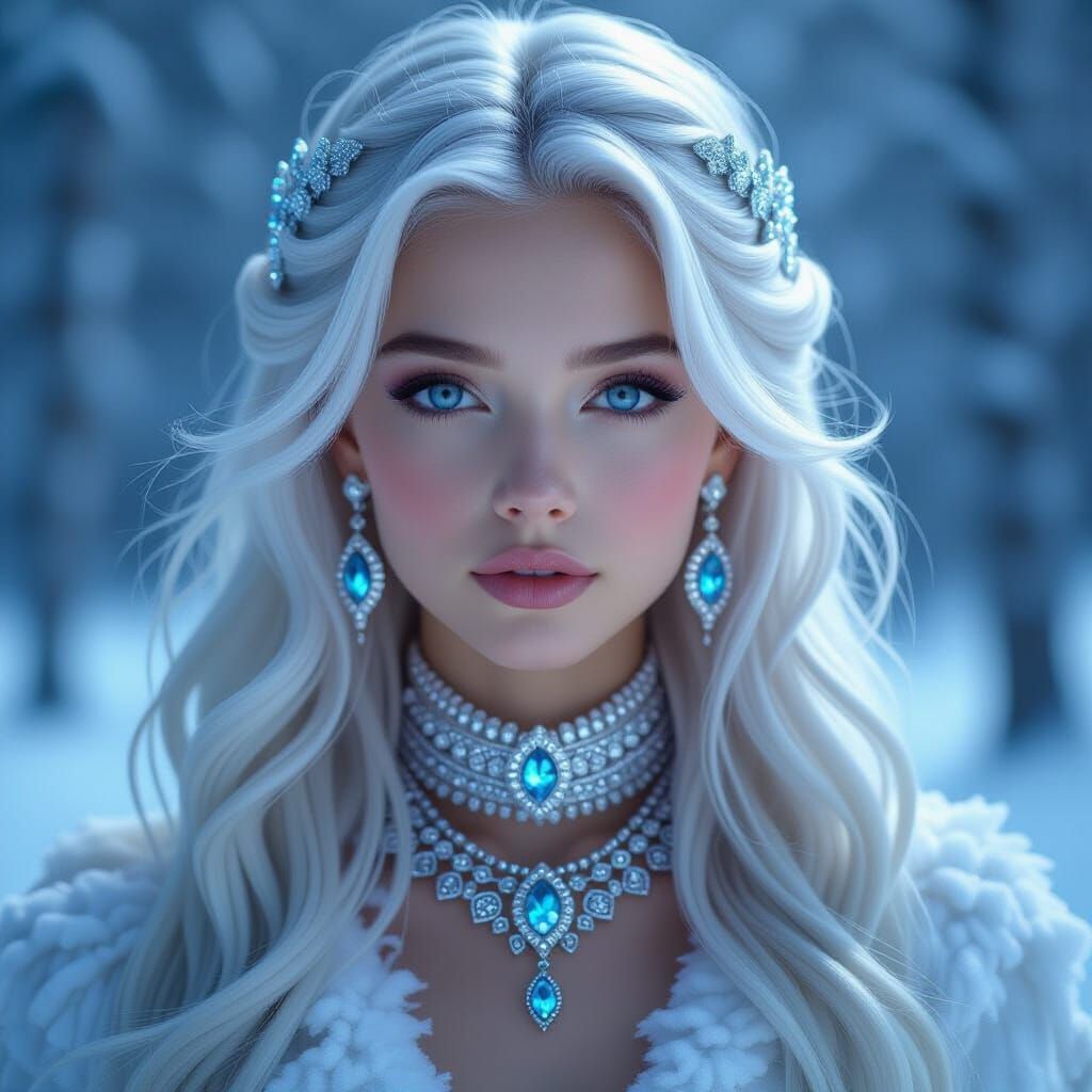 This image shows an otherworldly girl with long white hair and piercing blue eyes in a snowy forest. She is adorned with intricate winter jewelry in a futuristic and ethereal style.