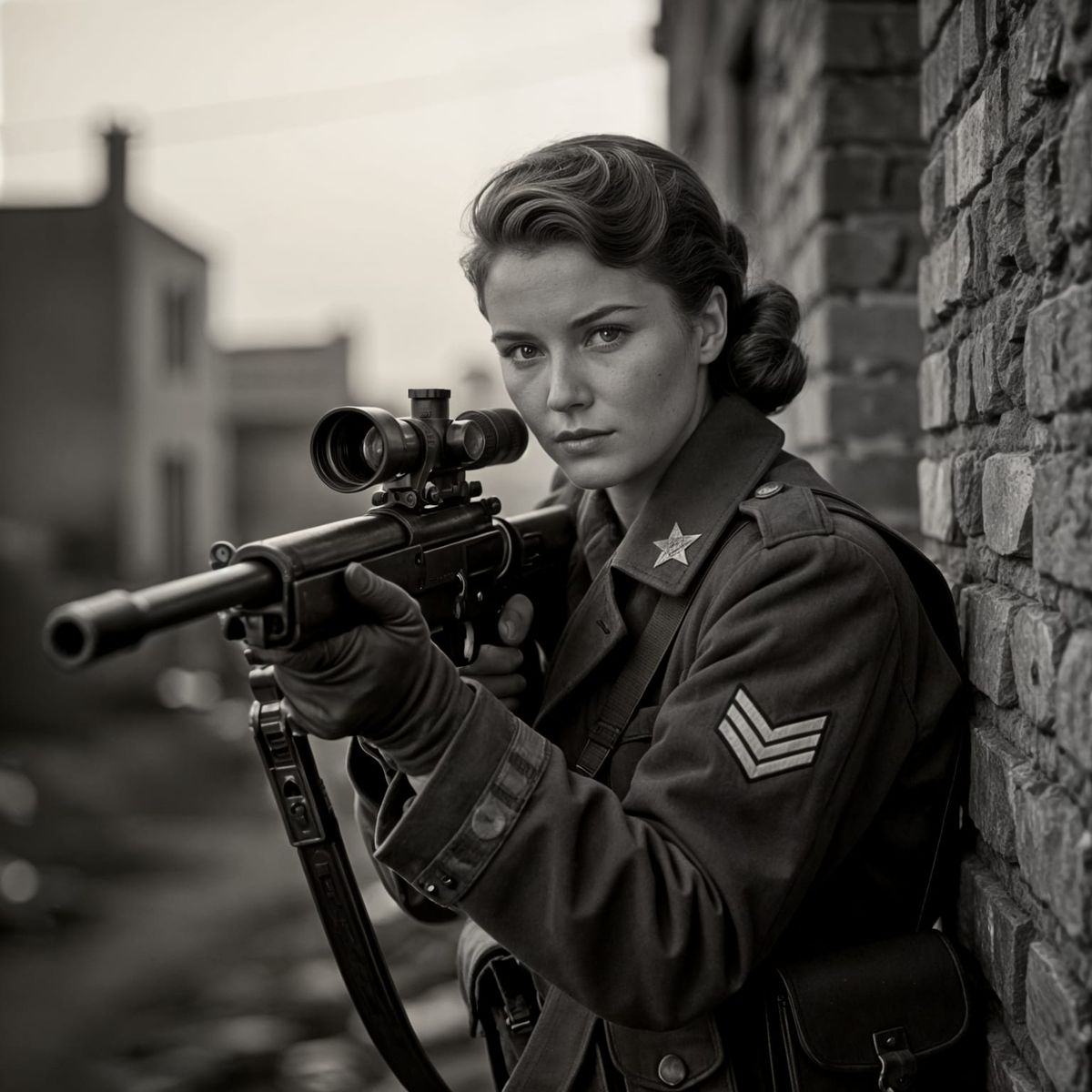 A beautiful female sniper captured in the style of vintage 1940s photography. This image evokes a classic, historical aesthetic.