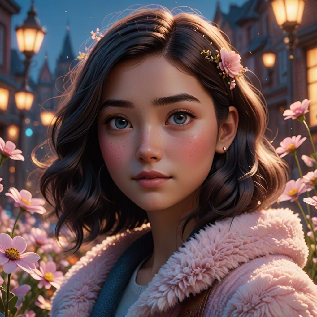 A captivating close-up portrait reminiscent of Disney concept art. The subject has a gentle expression, soft features, and sparkling eyes, rendered as 3D digital art with faux fur textures against a pastel gradient background.