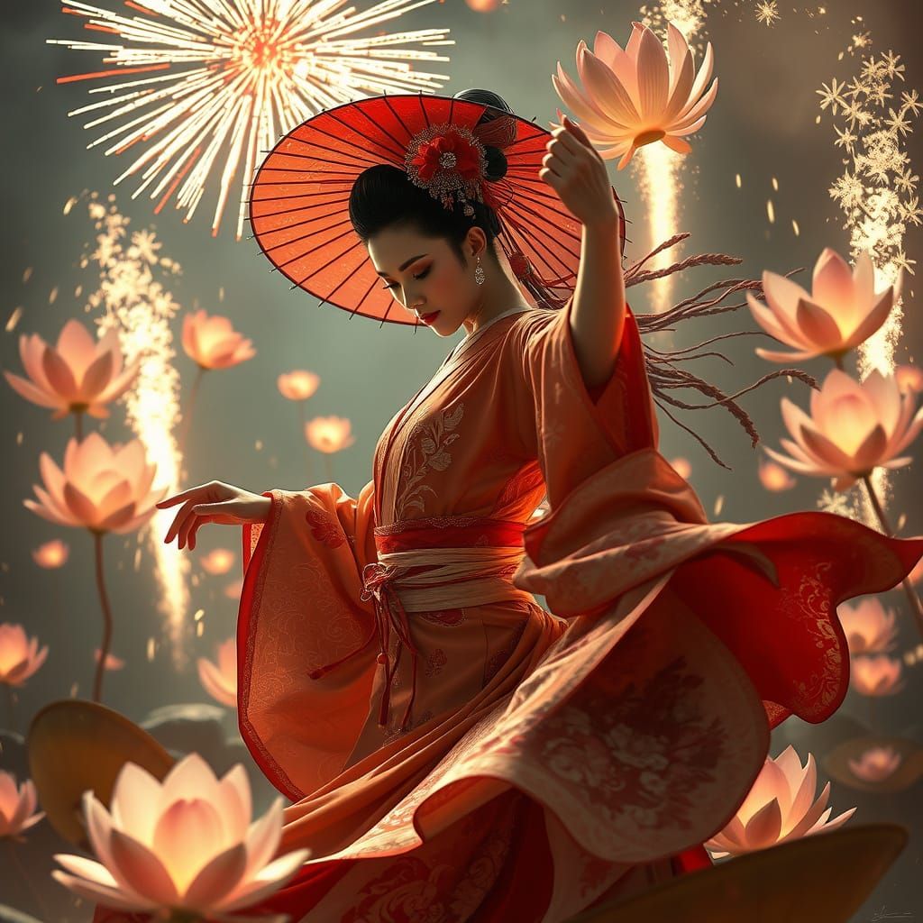 This image shows a beautiful Asian geisha dancing and twirling amidst flying lotuses. Fireworks and pyrotechnics add to the spectacle in this digital artwork.