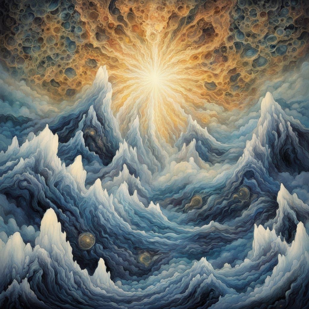 A hyperrealistic 3D image captures a geisha within flowing crystal water infused with quantum ink and bioluminescent pigments. Layers of liquid shimmer with fractal colors and molten gold, evoking a meditative, otherworldly atmosphere.
