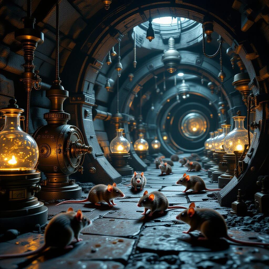 Photo-realistic. Fantastic fantasy. Let's view something novel. Heart warming, beautiful, exciting. Examine trending for the near future & present likely scene that most people will like. Key words: rats & secret chamber & stolen traps. Use meticulous attention to detail and texture.