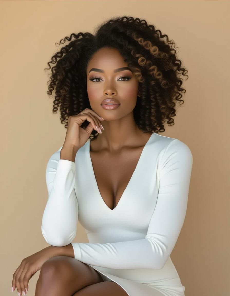 A photorealistic studio portrait of a confident woman with curly brown hair and a white dress, bathed in soft Rembrandt-style lighting against a beige background.