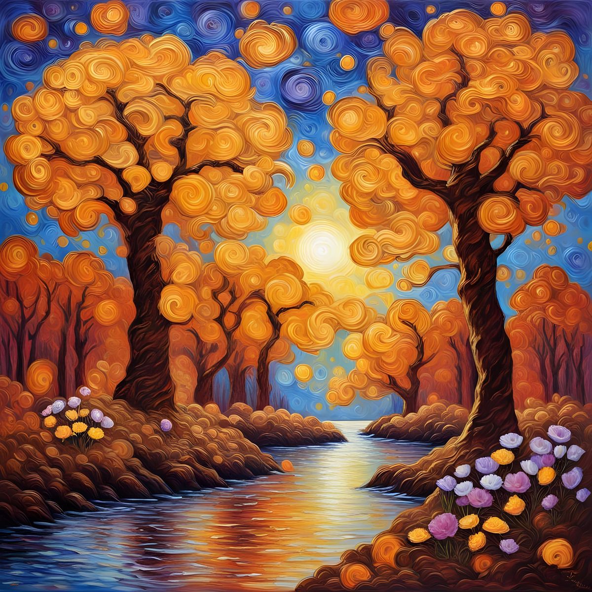A striking picture of a landscape with an amber river, chocolate trees, candy flowers, and cookie sun. The image is rendered in an expressionist style with impasto painting techniques.
