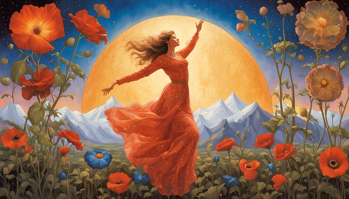 This image shows a woman flying low over snow-covered mountains amidst a vibrant field of wildflowers. It features a surreal garden with glowing creatures and kaleidoscopic sunset hues.