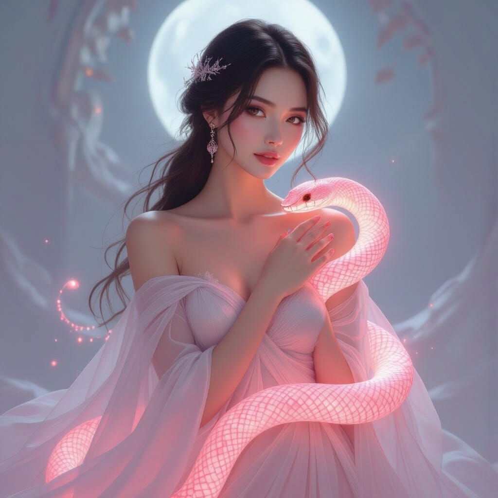 This image shows a mystical woman in a sheer gown, her skin glowing under moonlight. A pink snake coils around her, rendered with soft textures and luminous colors in a dreamy, ethereal style.