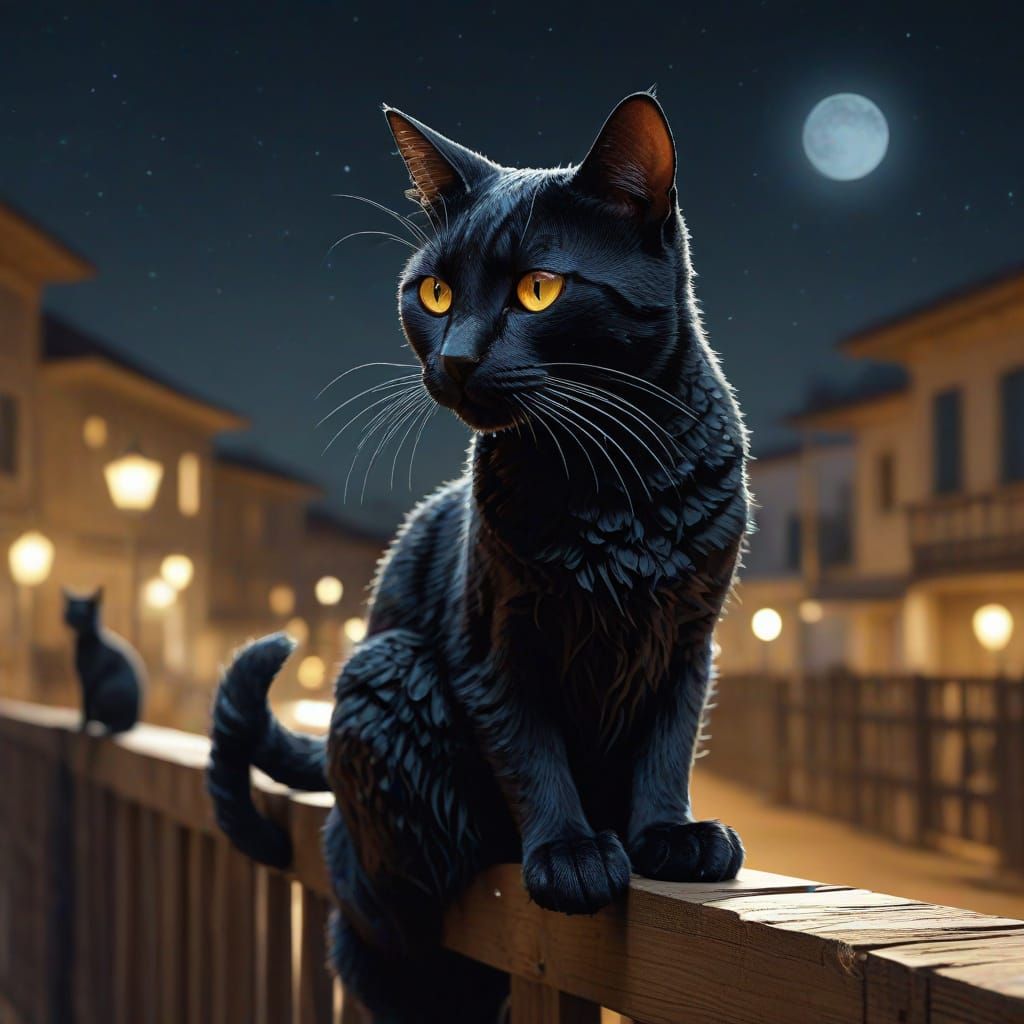 This image is an abstract representation of a cat on a fence at night, characterized by vibrant colors, creative lighting, and intricate patterns inspired by various art movements.