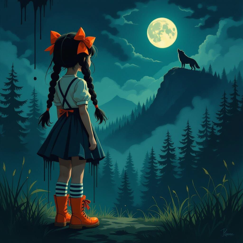 This image captures a girl as a silhouette in a dark forest, with a wolf howling at the moon. Rendered in a textured oil painting style with impasto techniques.