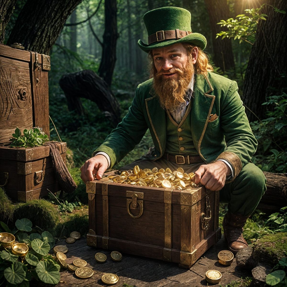 This image shows a realistic leprechaun protecting an antique wooden chest filled with gold. Shimmering light emanates from the chest, set within a wilderness environment with cinematic lighting.